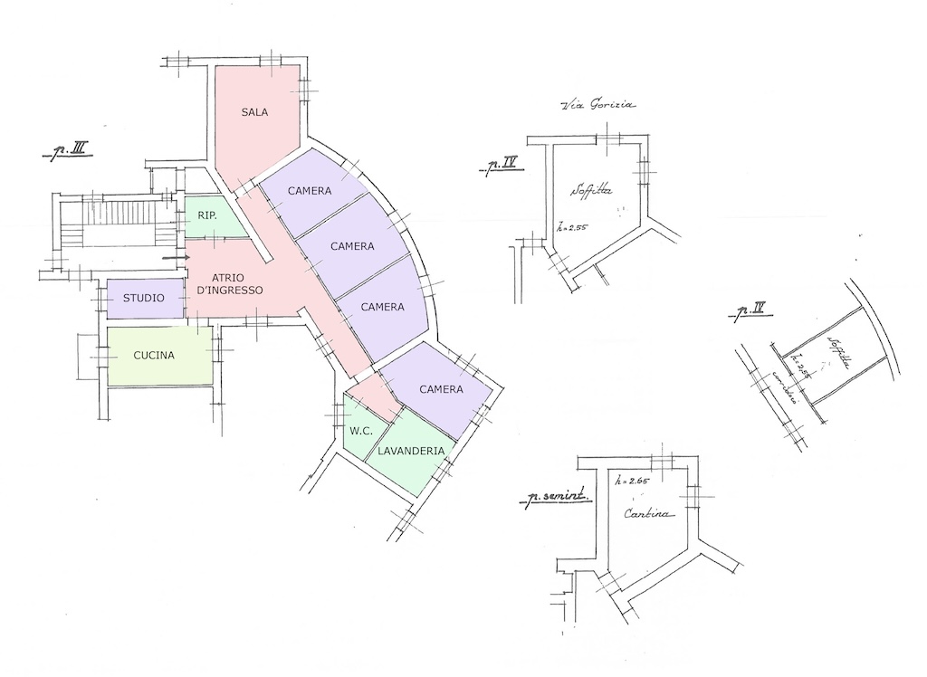 L'immobile è inoltre dotato di due ampi solai di cui uno finestrato e tranquillamente utilizzabile come studio (entrambe i solai confinano con l'appartamento) e di una grande cantina. Pur non essendovi il garage, l'immobile ha diritto al parcheggio di un'autovettura all'interno del cortile condominiale.