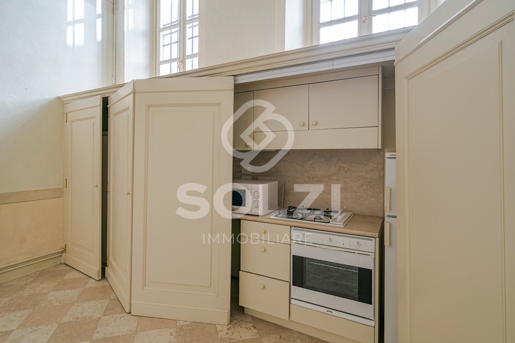 L'appartamento, ristrutturato verso la fine degli anni '90, si presenta in ottime condizioni, impreziosito da soffitti alti (quasi 5 metri) molto scenografici con volte a botte ed affreschi.